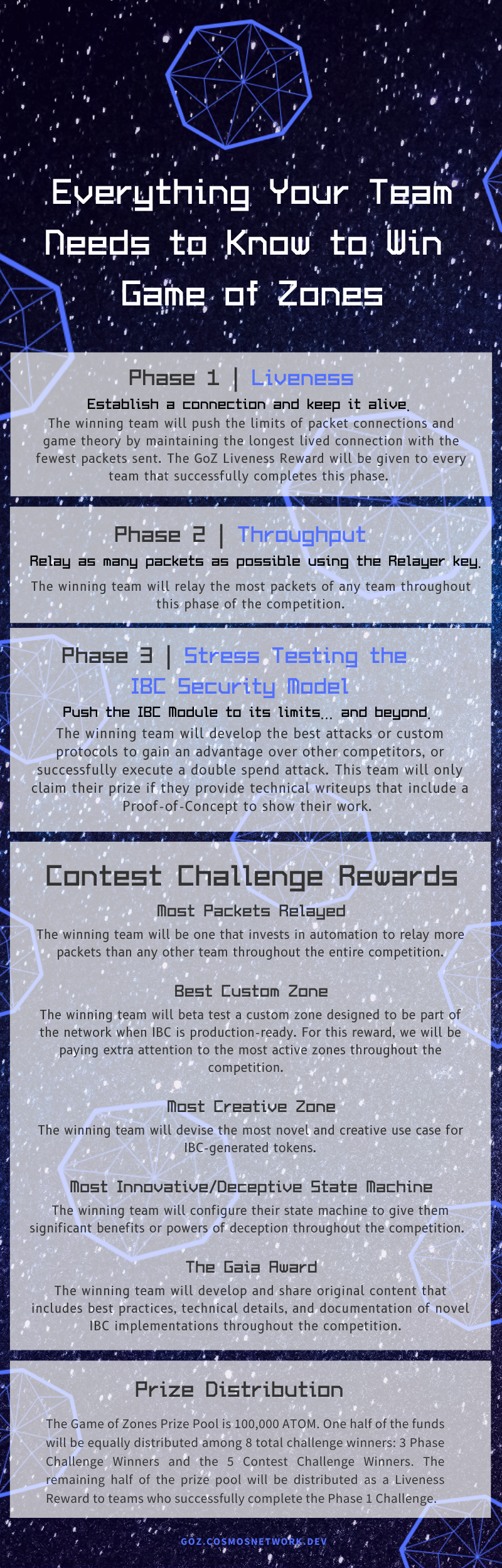The most important goal of Game of Zones is to prepare network operators for the entirely new set of abstractions that will come when IBC is production ready. It has been incredible to see participants and the overall community rise to this challenge, and to watch teams become experts in operating an on-chain lite client. Congratulations to everyone who successfully completed Phase 1 of Game of Zones — and best of luck in Phases 2 and 3!